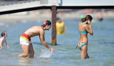 But the striker didn't wait long to get his revenge and clasped his girlfriend around her middle threatening to dunk her under the water.